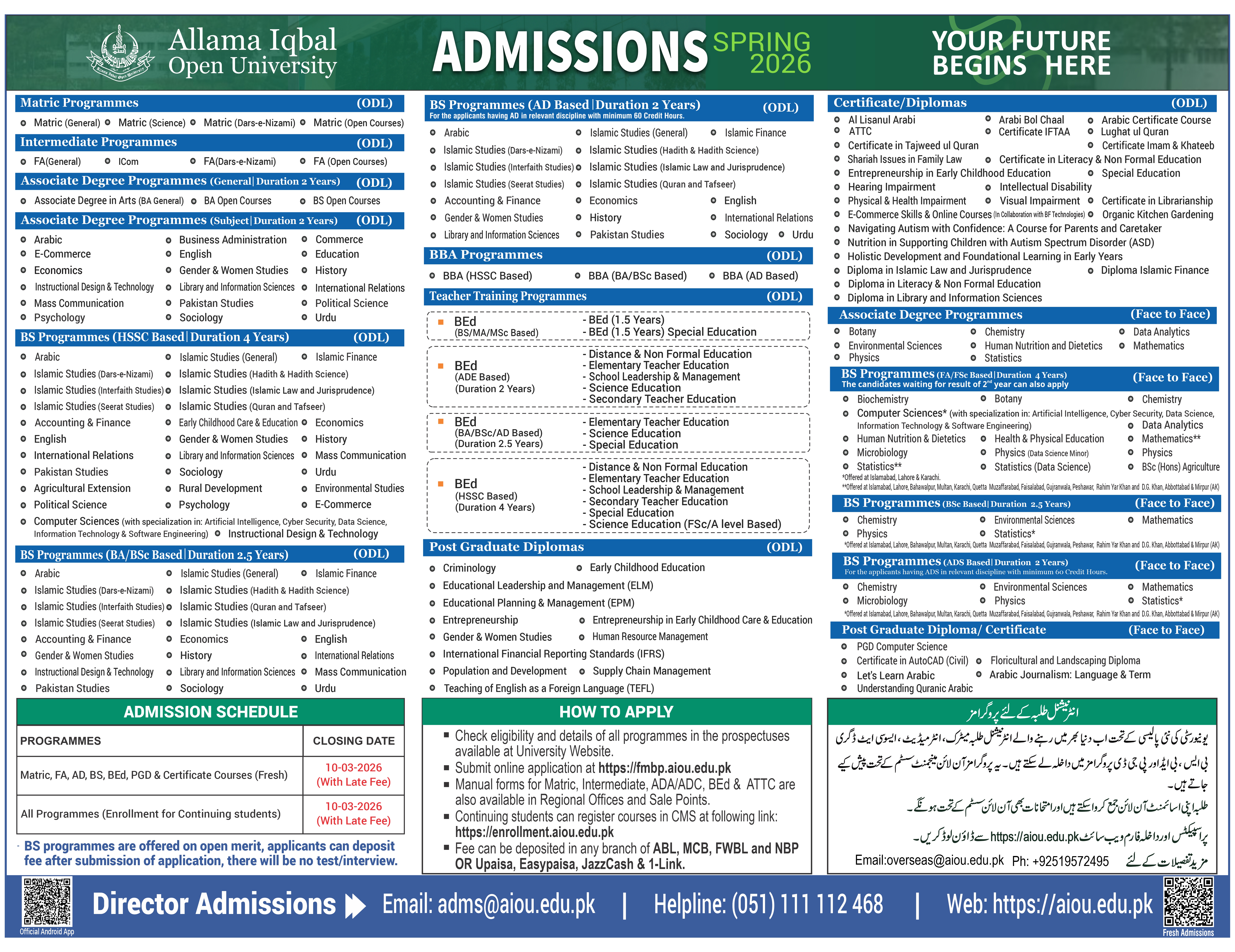 ๐ Admissions are now open for Spring 2026 at Allama Iqbal Open University (AIOU) in a wide range of programmes under Open & Distance Learning (ODL) and Face-to-Face systems.