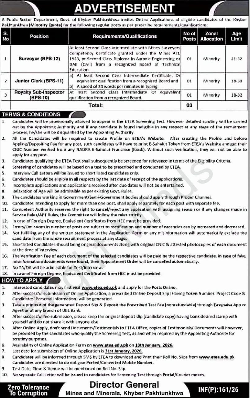 A Public Sector Department, Government of Khyber Pakhtunkhwa invites online applications from eligible candidates of Minority Quota for the following regular posts under the prescribed requirements and qualifications.