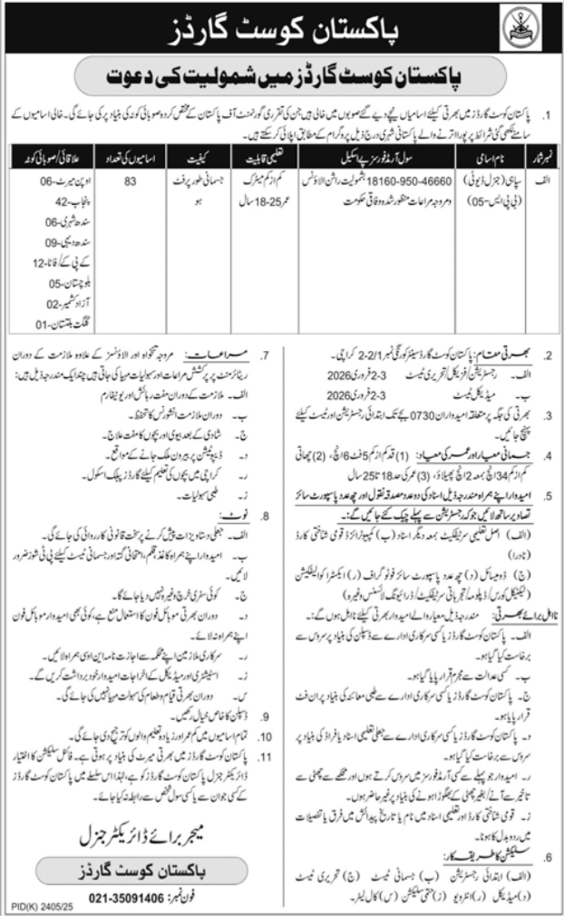 Pakistan Coast Guards invites applications from eligible Pakistani male candidates for recruitment in various positions. This is a great opportunity to serve the country by joining a disciplined and prestigious force.